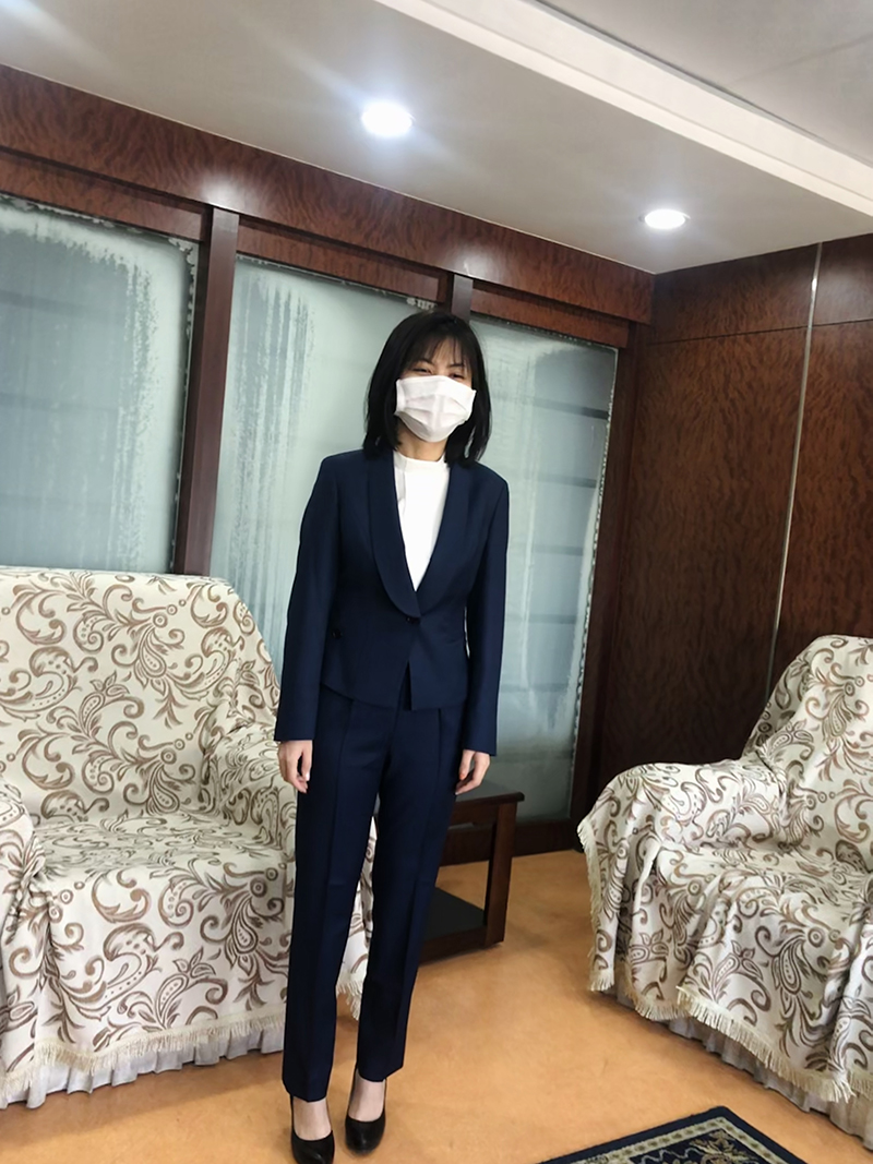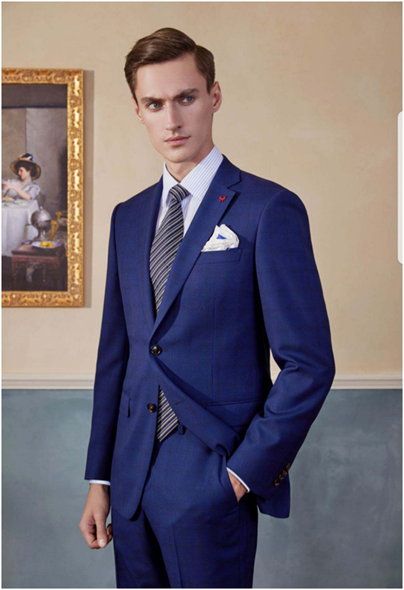 打破传统国有单位固有的古板老式西服,选用了高级成衣订制面料,独特花纹,女士采用青果领,衣身采用前短后长设计,添加燕尾后摆,前面提升腰线,后片恰到好处的遮挡至臀围线,整体视觉效果拉伸,是穿着者显得更加高挑,独特彰显活力不失时尚;男士采用的是传统两粒扣西服,平驳领显端庄稳重,后背开双衩又略显时尚。
