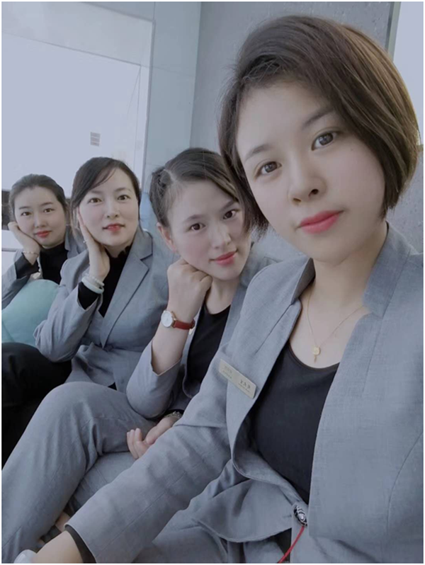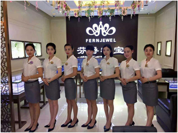 旗下拥有众多品牌珠宝门店的芬爵珠宝公司,对服装品质要求极高,端庄有亲和力是珠宝销售人员制服的首要条件,整体灰白色调搭配,简洁舒适凸显高级感,外套采用小立领设计,衬衫则以V领形式,露出前领,方便销售人员向顾客展示产品,充分考虑了穿着者的工作性质及需求,胸前以纯手工胸花作为点缀,整体搭配亲切干练不失单调。